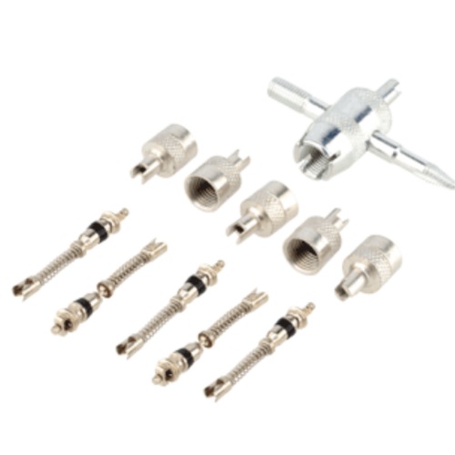 Набор для ремонта вентиля камер предназначен для ремонта вентиля камер и замены золотников камер в дорожных условиях. Укомплектован пятью колпачками вентиля, пятью длинными золотниками и ключом.