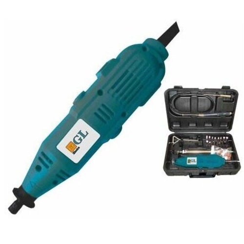 Электрический гравер GL ID0200G используется для обработки различных поверхностей (шлифование, резные работы, щёточная чистка, полирование, разрезание, предварительное сверление). На задней части корпуса предусмотрена петля для подвешивания инструмента, а в комплекте имеется подставка-держатель.