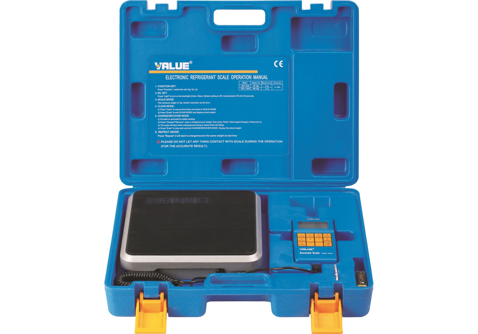 Весы электронные Value VES-50A для хладагента обладают прочной конструкцией и оснащены большой платформой для больших емкостей с хладоном. Поставляются в пластиковом кейсе. Для работы весы нужно вынуть из кейса и установить на ровную поверхность.