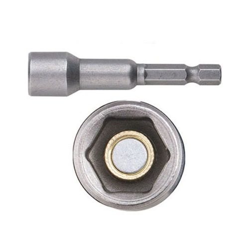 Насадка для шуруповертов и дрелей. Предназначена для работы с крепежом, который имеет шестигранную головку (кровельный саморез, болт, гайка). Внутри головки магнит для крепежа. Изготовлена из металла.