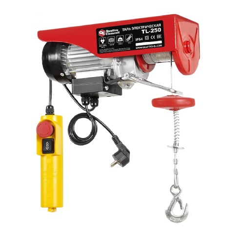 Таль электрическая 250 кг Quattro elementi TL-250 793-688 предназначена для подъема и опускания грузов весом до 250 кг на высоту до 6 м (125 кг - до 12 м). Данная модель может использоваться в рабочих зонах, гаражах, подсобных и производственных помещениях, на строительных и ремонтных площадках, складах, сервисных станциях. В комплект поставки входят специальные крепления для фиксации тали на балке и блок полиспаст.